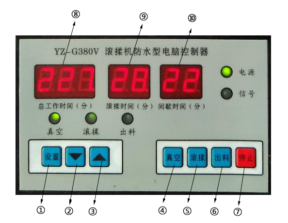 ⑦號:停止鍵,停止真空滾揉機工作。